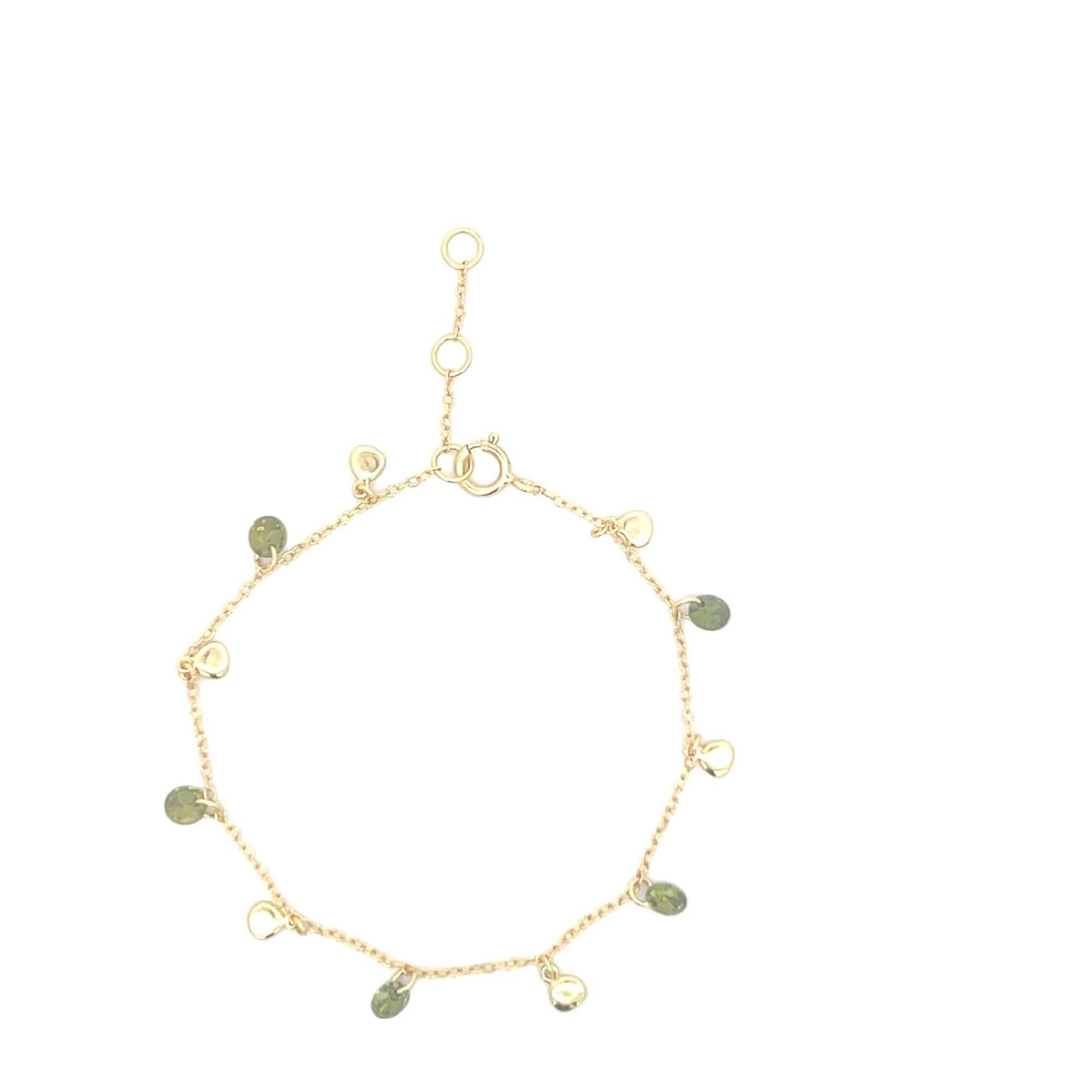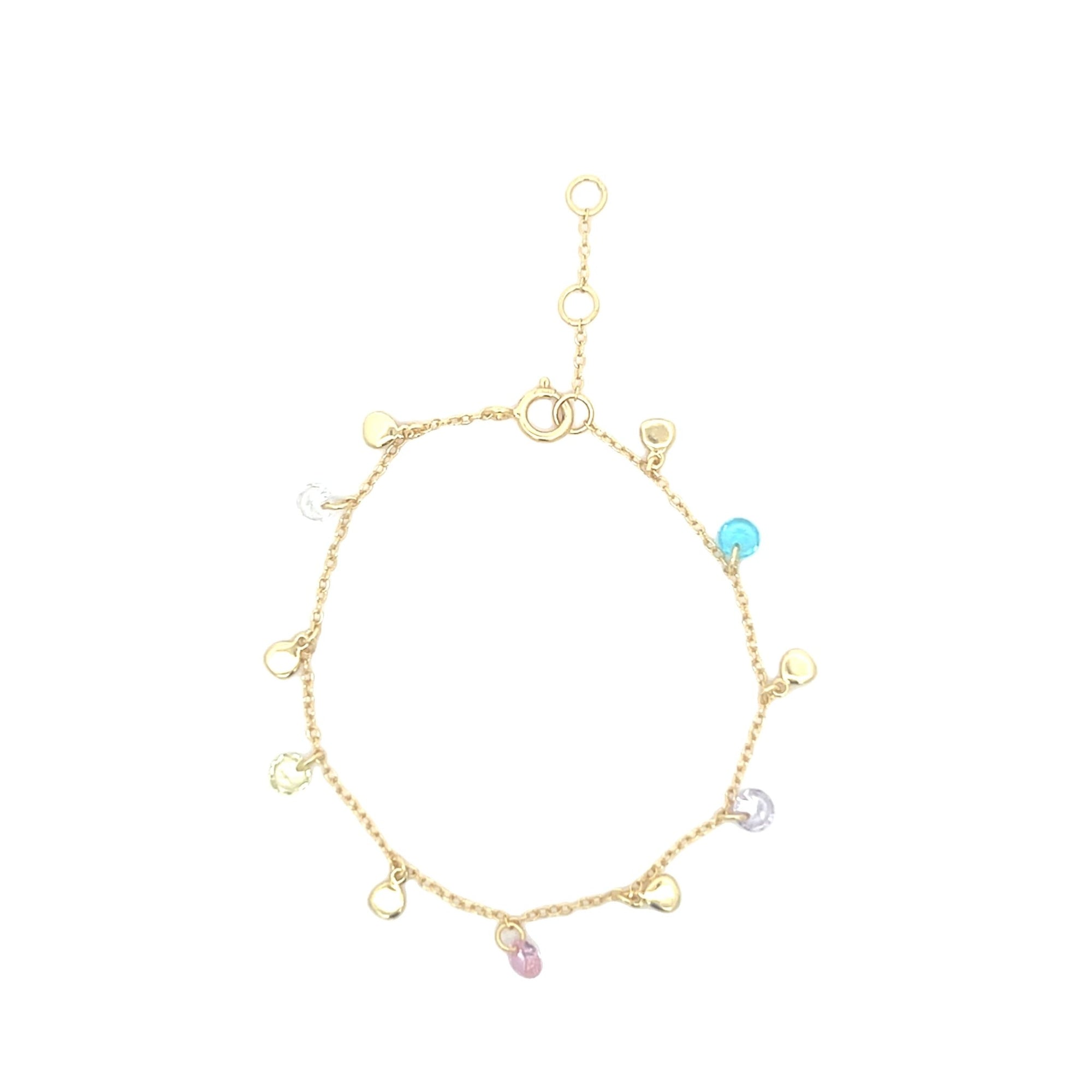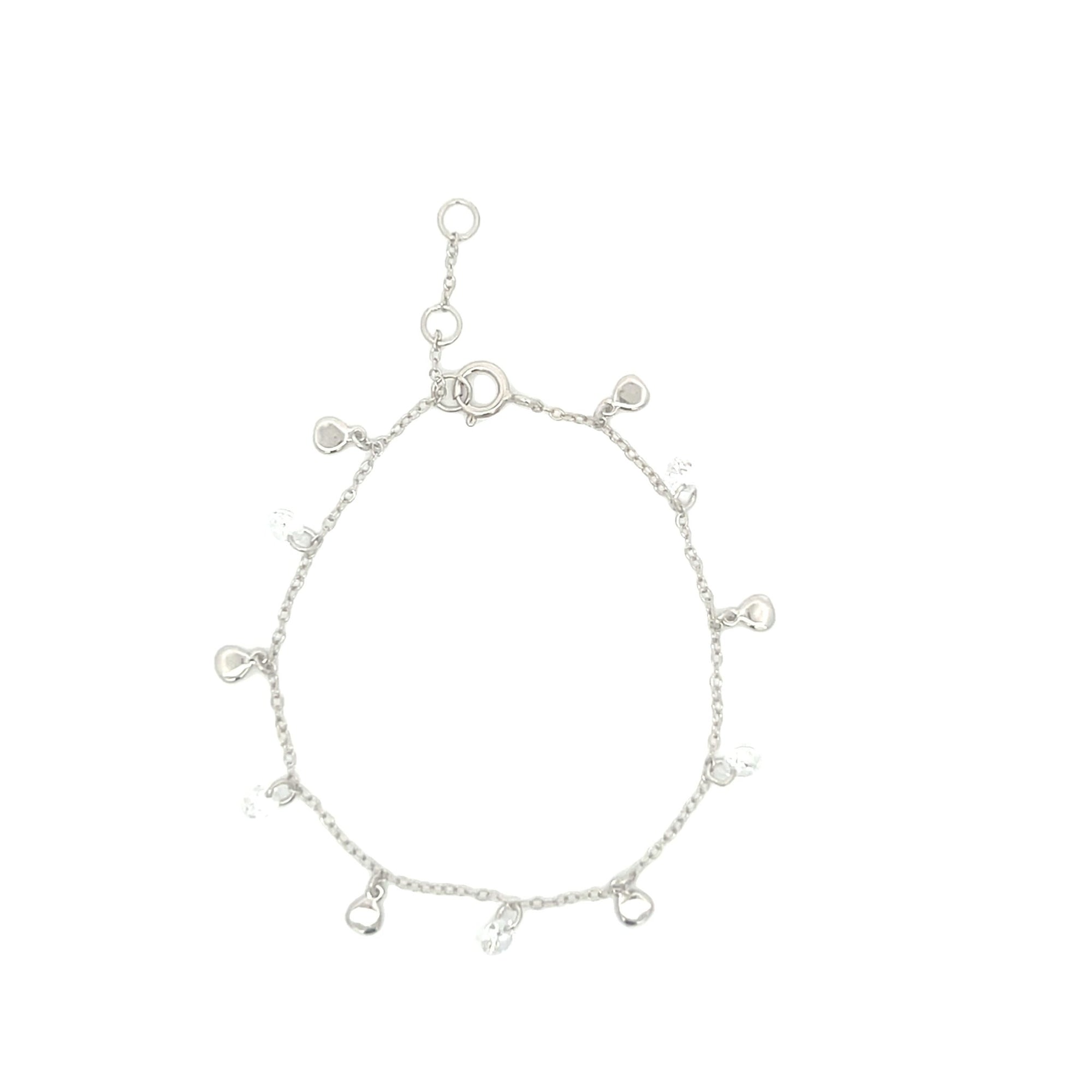 There are 6 cubic zirconia stones measuring 4mm and 6 discs measuring 3mm that hang off the bracelet .