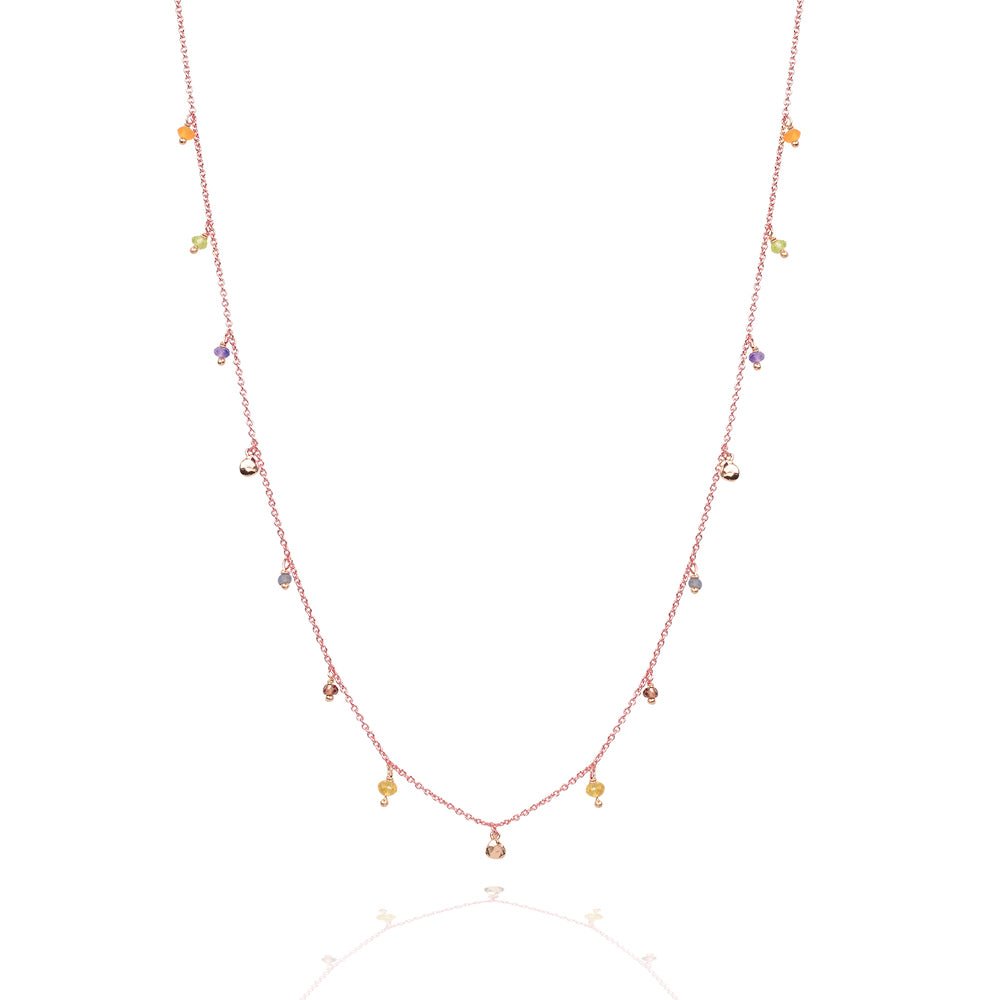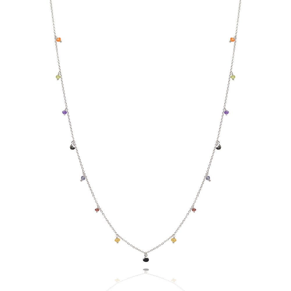Wear this necklace to align your chakras. When we are balanced in our chakras our energy is in alignment which leads to balance in all areas of our lives. It has 12 semi-precious coloured stones relating to the different chakras and three small round discs in between.