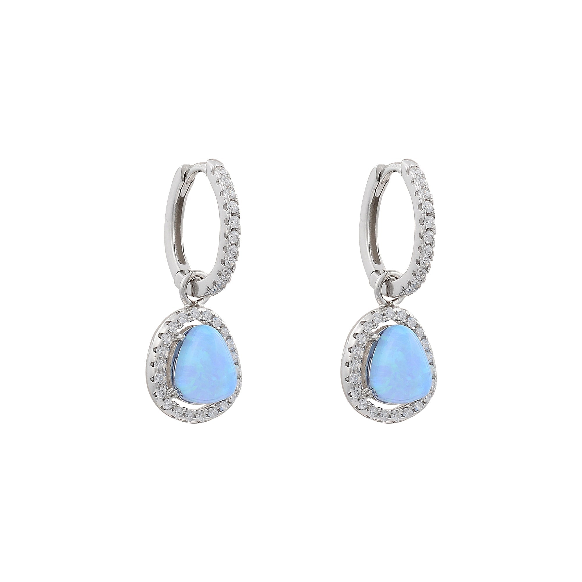 Pear-shaped opalite stone framed by micro-pavé CZ crystals creates a soft, glowing halo in these gold-plated huggie earrings. The front face is lined with clear CZ stones for polished detail from every angle. Versatile enough for everyday wear or layered styling, these dainty drops bring luminous elegance to any occasion—from morning meetings to bridal events. Refined craftsmanship at an accessible price point.