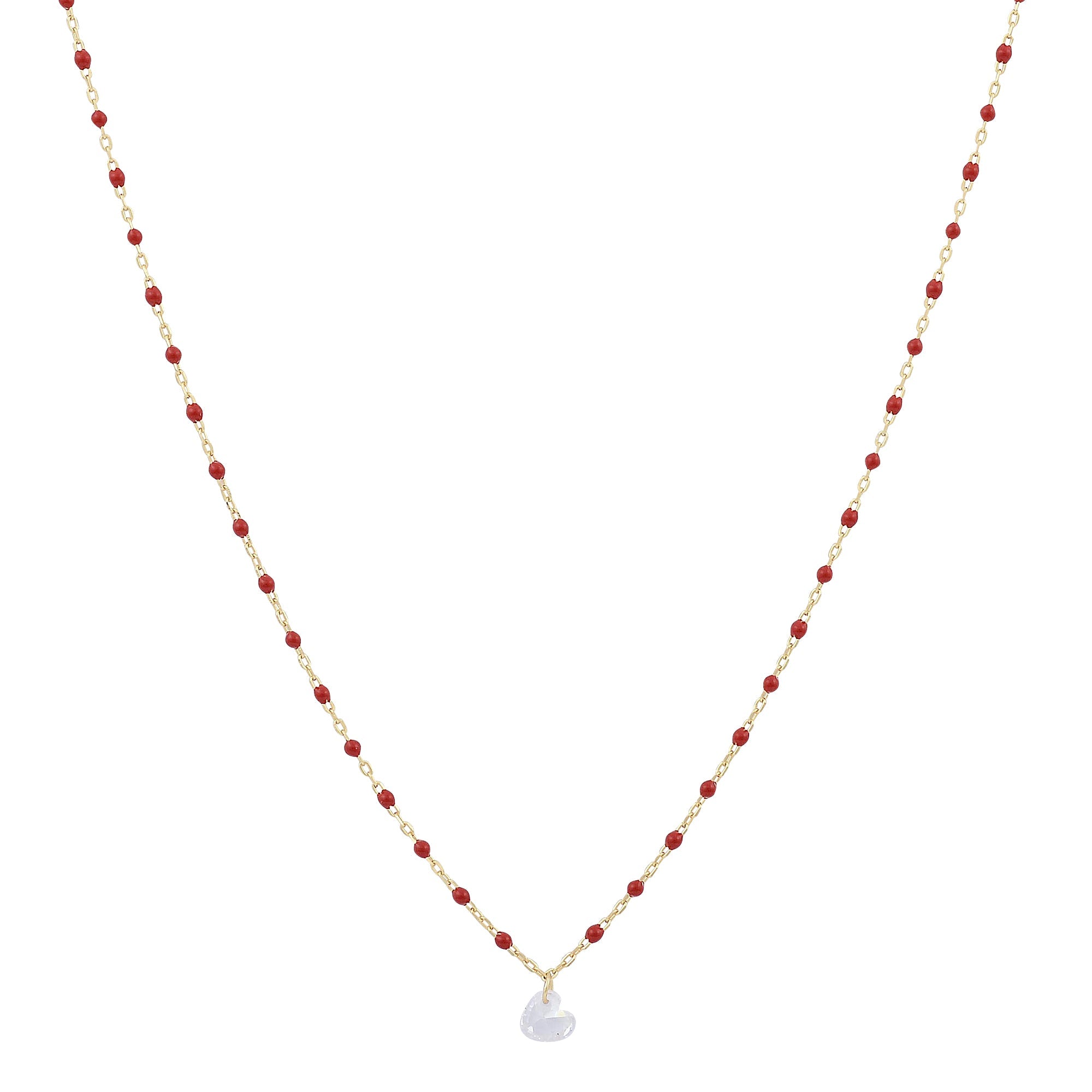 This red rosary chain choker pairs vibrant enamel beads spaced along a gold-plated cable chain with a sparkling faceted clear CZ heart pendant hanging at the centre. The result is something that feels vintage-inspired and modern at the same time — romantic without being predictable, colourful without being loud. It's the necklace your all-black outfit has been waiting for.