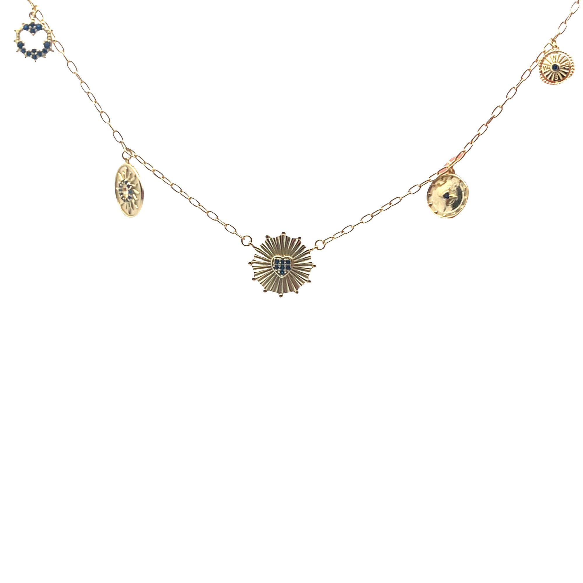 This Sacred Heart Sunburst Multi Charm Necklace from Inspirit Designs does the work for you. Five carefully chosen circular charms sit evenly spaced along a delicate cable chain, each one different, each one deliberate — together creating a curated, pre-layered look that feels deeply personal rather than simply put-together.