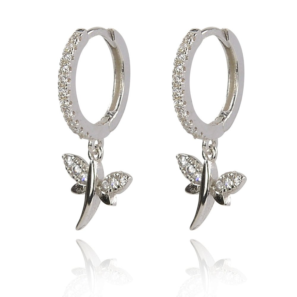 Light, joyful, and just the right amount of magical — these gold dragonfly drop huggie earrings carry a meaning as beautiful as their design. Each gold-plated hoop is lined with a full micro-pavé band of sparkling clear CZ stones, from which a delicate dragonfly pendant is suspended, its upper wings catching the light with their own tiny CZ accents. The dragonfly has long been a symbol of joy, transformation, and living fully in the present moment — and worn close to the ear, these nature-inspired dangle earrings feel like a quiet, personal reminder of exactly that.