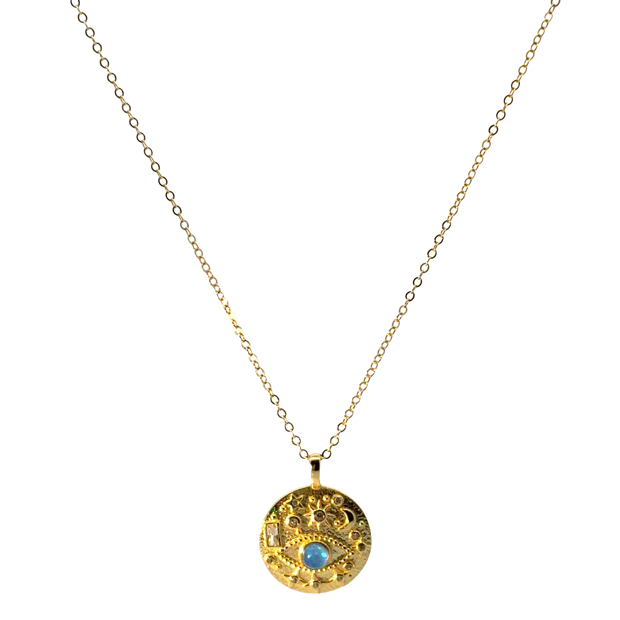 A celestial protection piece with purpose. This gold-plated evil eye disc necklace features a shimmering simulated opal eye at its centre, framed by a textured coin pendant with crescent moon, starbursts, and sparkling CZ stones. Wear solo as a boho talisman or layer with other chains for a spiritual choker moment. Light, meaningful, and effortlessly wearable every day.